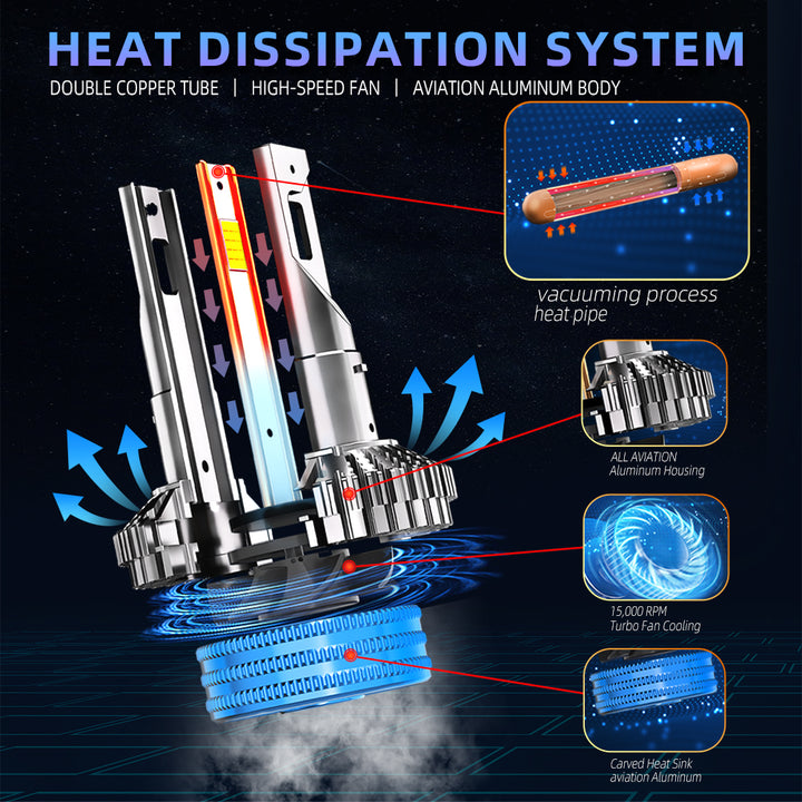 ❄️ Edistynyt lämmönpoistojärjestelmä yli 60 000 tunnin käyttöiälle: Suunniteltu alan johtavalla lämpöputkisuunnittelulla, kaksoiskupariputkilla ja lentokonealumiinirungolla. Korkeanopeuksinen, äänetön 15 000 kierroksen turbo-tuulettin takaa nopean jäähdytyksen, jolloin polttimot toimivat luotettavasti jopa yli 60 000 tuntia ja kestävät äärimmäisiä työskentelylämpötiloja välillä -60℃ - +100.